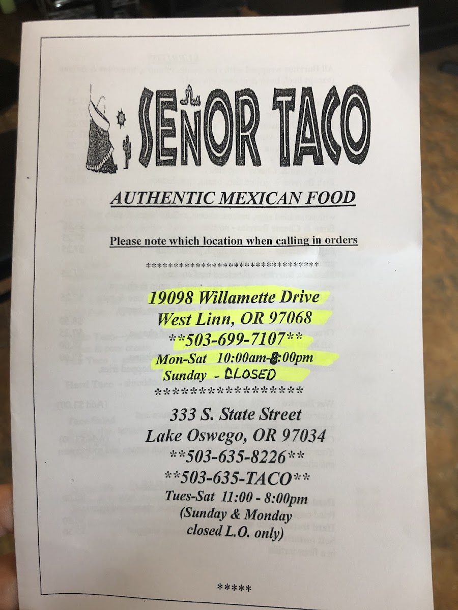 Welcome to West Linn Senor Taco, a hidden gem nestled in the heart of West Linn, Oregon. This vibrant eatery boasts an enticing menu, featuring classic Mexican fare that never disappoints. Start your culinary adventure with their Tostadas, where crunchy fried corn tortillas come topped with beans, lettuce, cheese, and fresh tomatoes. For a cheesy delight, the Quesadillas, filled with gooey melted cheese and your choice of meat, are a must-try. Additionally, their Taquitos, crispy and stuffed with succulent shredded beef, offer a delightful crunch that pairs wonderfully with guacamole.